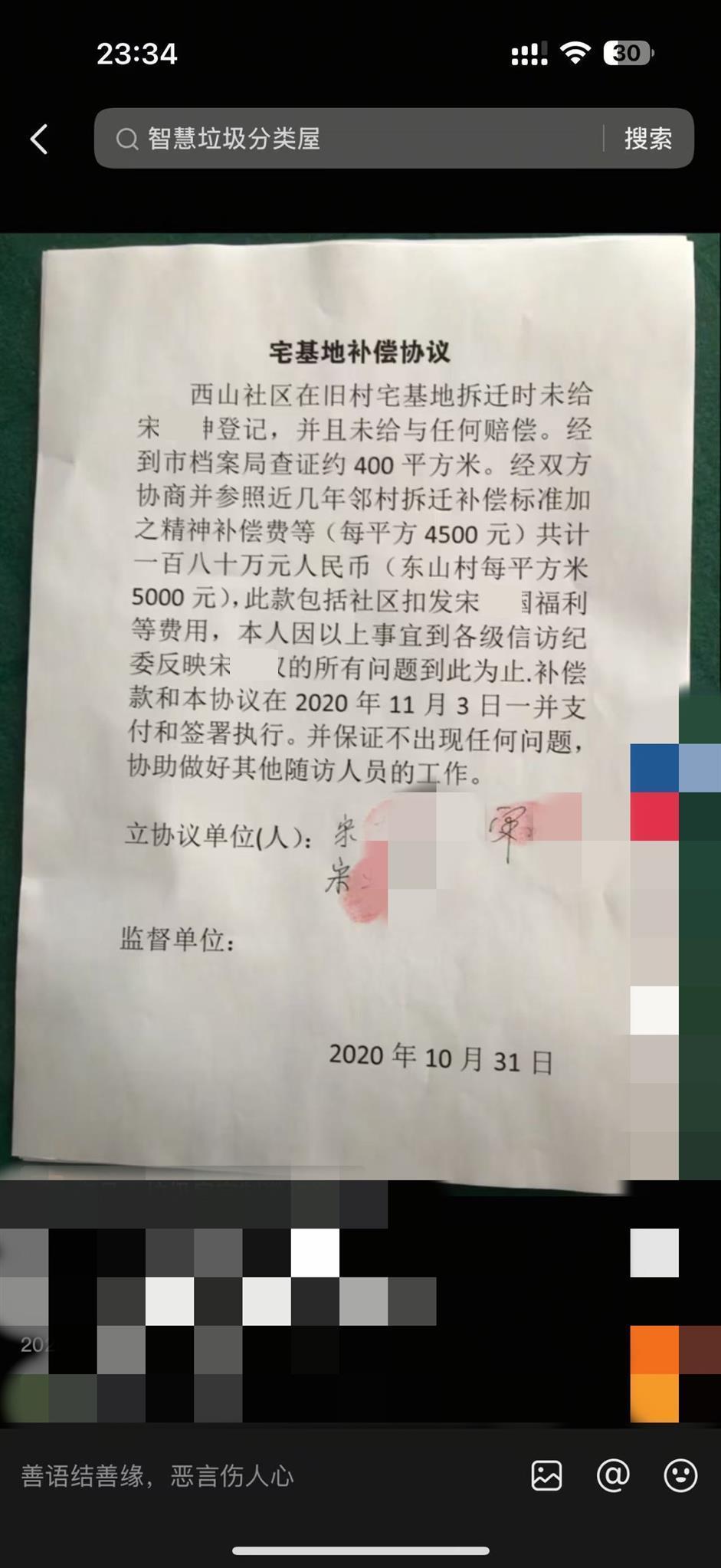 宋女士向记者出具两份落款时间均为2020年10月31日的《宅基地补偿协议》。该协议显示,宅基地经到市档案局查证约400平方米,经双方协商,并参照近几年邻村拆迁补偿标准,赔偿费为180万元。一份协议上有宋某国、宋某全及两人父亲的签名和手印,但未有宋某某签字;另一份协议上写有“西山社区”字样,并有宋某某、宋某国的签名和手印。宋女士告诉记者,此后宋某某向宋某国转账180万元,宋某国向宋某全转账86万元。